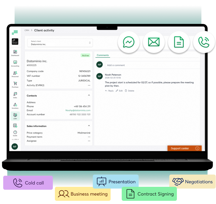 The CRM solution integrates the entire sales and accounting process — from the first contact to long‑term collaboration, including all accounting data. Clear stages, product, service, client, debt, payment and other key information, along with automated actions, enable the team to work faster, more accurately, and more efficiently.